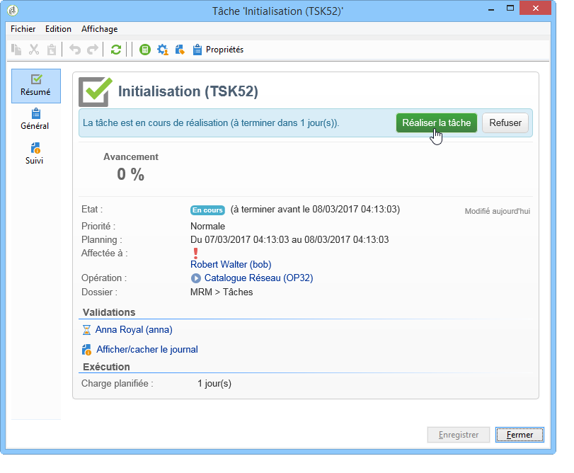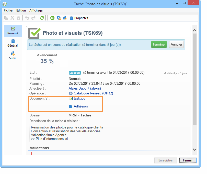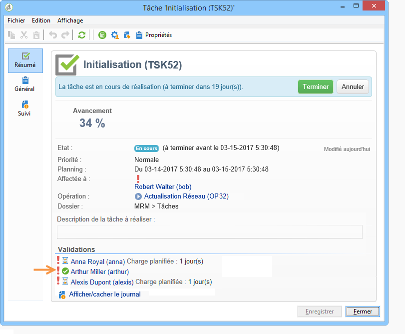 A chaque validation d'un intervenant, l'état d'avancement de la tâche est automatiquement mis à jour.