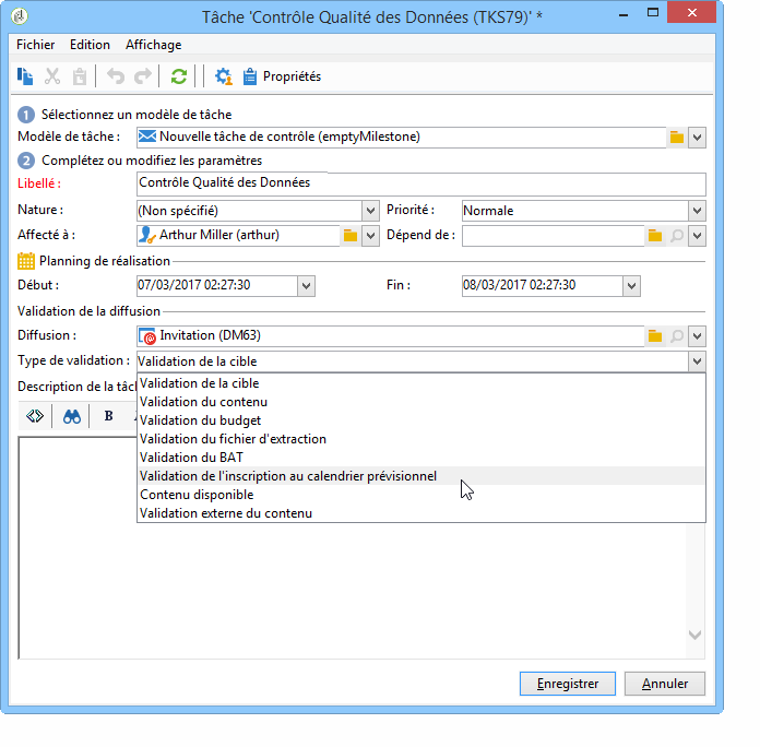 Une tâche de type Tâche de contrôle est attachée à la validation d'une diffusion : validation du ciblage, du contenu, du fichier d'extraction, du budget ou du BAT.