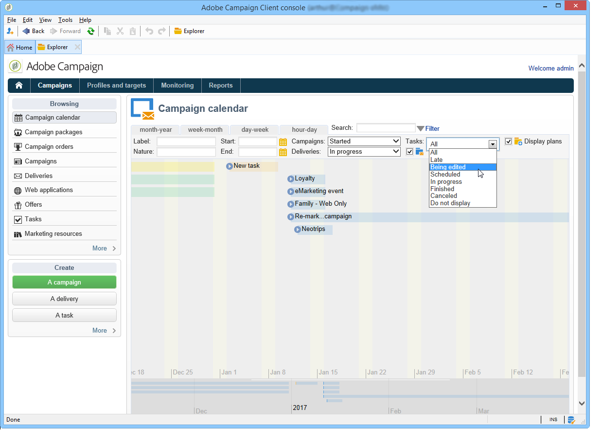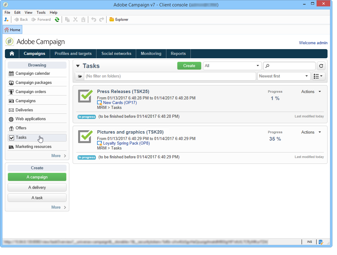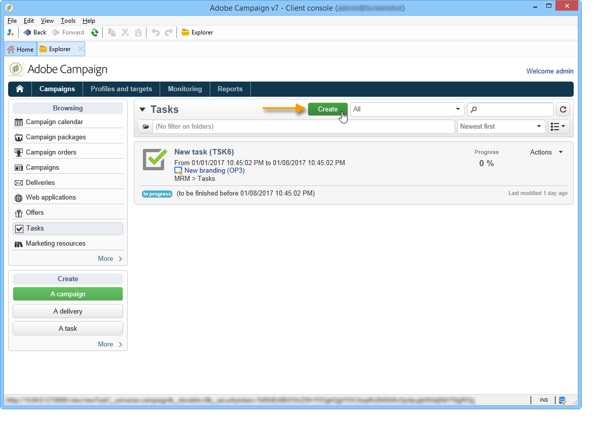 작업을 만들려면 Tasks 링크 위치 Campaigns 탭을 선택하고 Create.