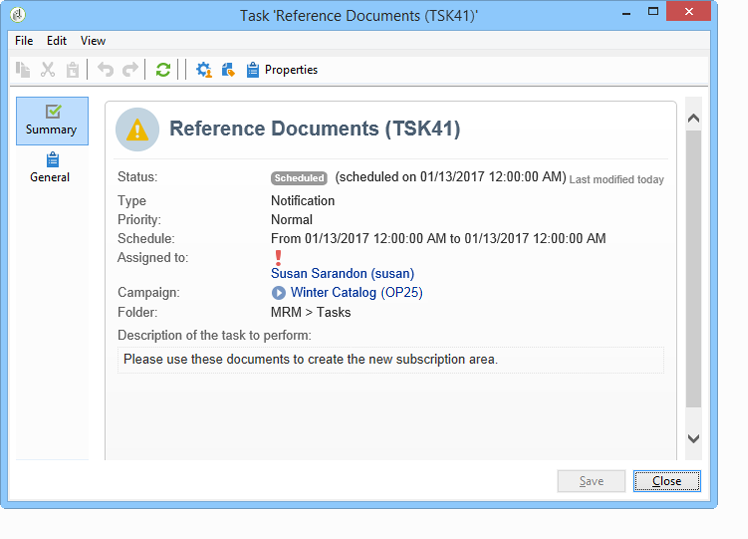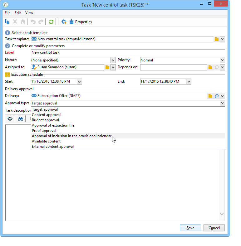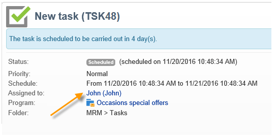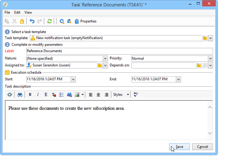 Assigned to : 이메일을 받을 운영자 또는 운영자 그룹입니다. 전자 메일이 전송되면 작업을 다시 할당하면 새 연산자에게 전자 메일이 전송되지 않습니다(이 경우 작업을 다시 초기화하고 시작 날짜를 변경해야 함).