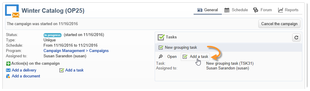 그룹화 작업을 기반으로 그룹화된 작업을 만들려면 캠페인 대시보드로 이동하여 그룹화 작업 이름을 클릭하여 설명을 표시한 다음 를 클릭합니다 Add a task.