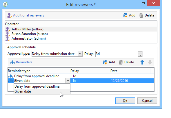검토자 구성 창의 아래 섹션에서 작업에 대한 승인 일정을 정의할 수 있습니다. 기본적으로 검토자는 제출 날짜부터 3일을 시작하여 작업을 승인합니다. 미리 알림을 구성하여 승인 마감 시간 전에 관련 운영자에게 자동으로 보낼 수 있습니다.