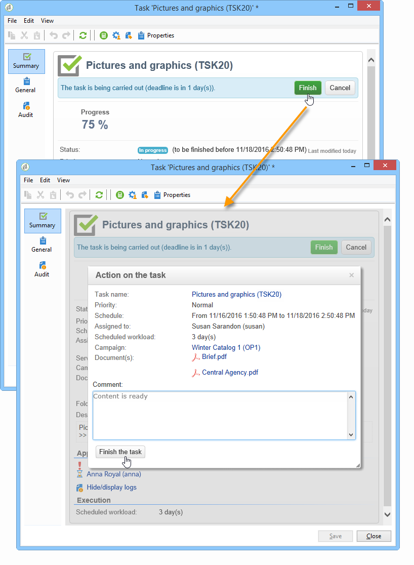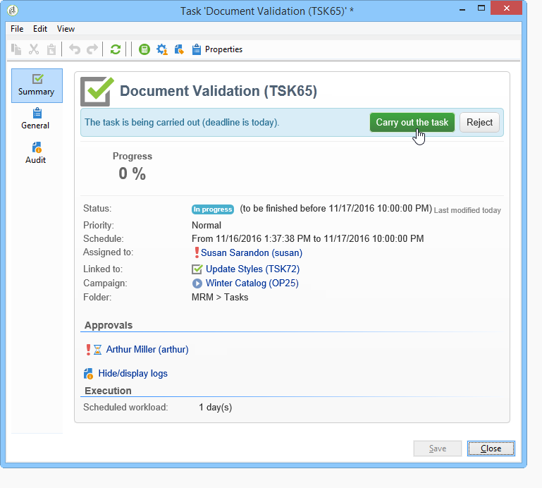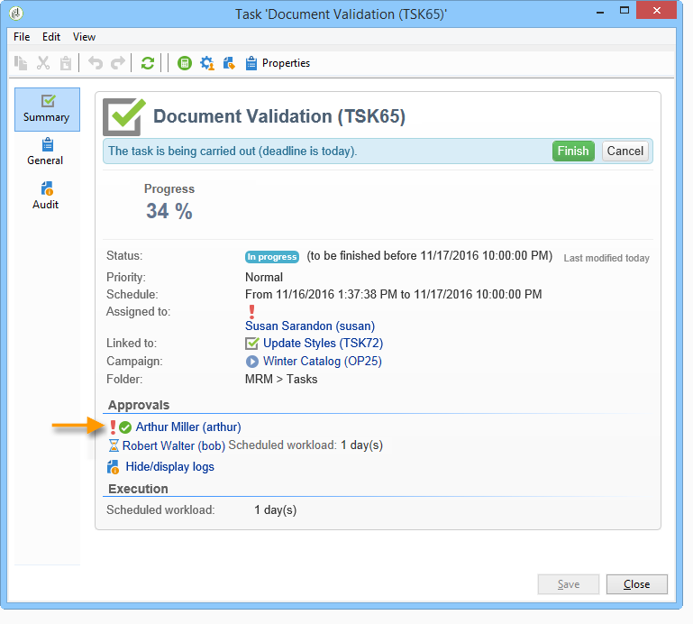 작업 상태는 To approve 활성화한 경우 Enable task validation 옵션 Resources 작업의 창.