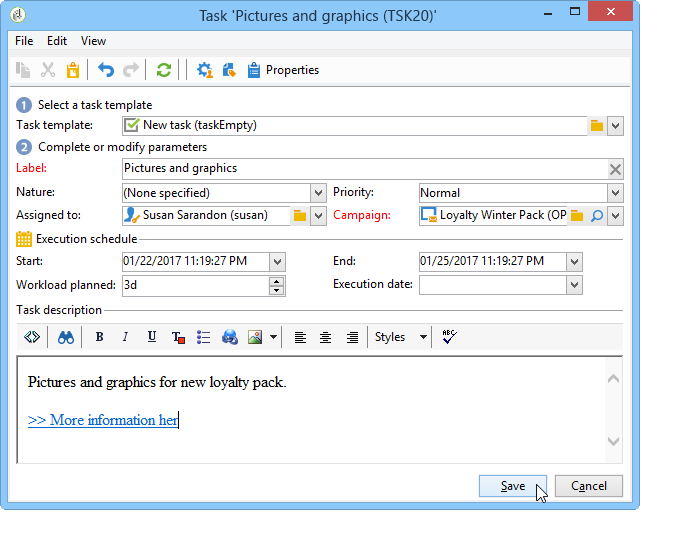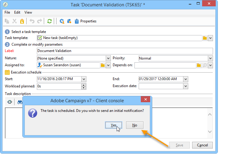기본적으로 Adobe Campaign 연산자가 작업을 만들면 자동으로 해당 작업에 할당됩니다. 다른 연산자를 선택하려면 Assigned to 필드.