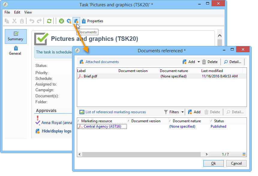 작업에 문서 및 마케팅 리소스를 추가할 수 있습니다(자세한 내용은 마케팅 리소스 관리). 이렇게 하려면 작업을 열고 Documents 아이콘을 클릭합니다.