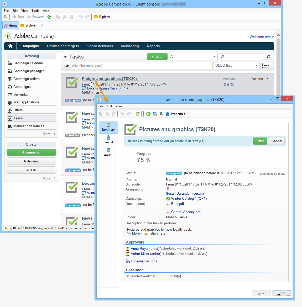 Adobe Campaign을 사용하면 작업을 만들고 애플리케이션 내에서 직접 전체 라이프 사이클을 관리할 수 있습니다. 프로그램 및 캠페인 구현을 Adobe Campaign 운영자 또는 외부 서비스 제공자에게 할당된 작업으로 분류할 수 있습니다. 이 작업 모드에서는 모든 프로그램 참여자와 외부 참여자를 포함하는 개방형 공동 작업 환경을 만들 수 있습니다.
