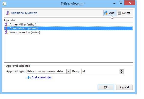 연산자 목록을 지정하려면 Edit… 첫 번째 검토자의 오른쪽에 연결하고 아래 표시된 대로 필요한 만큼 연산자를 추가합니다.