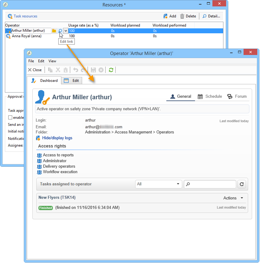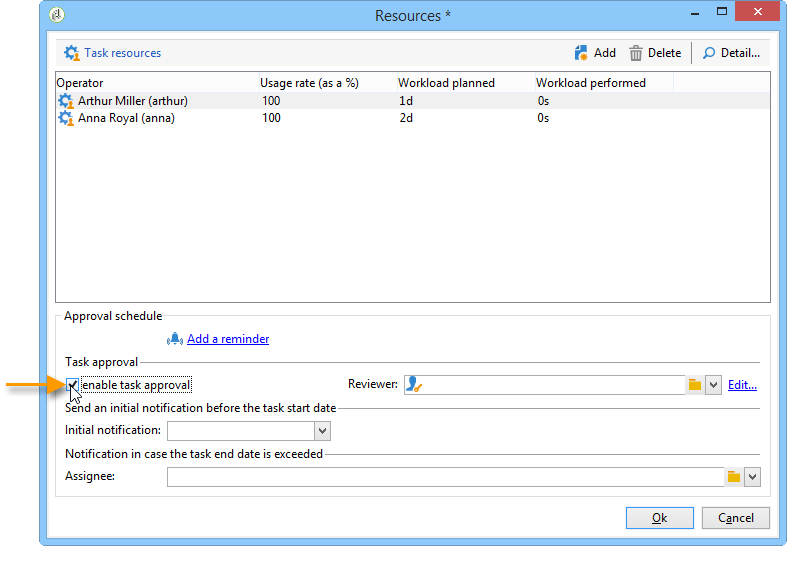 참여자 외에, 담당자가 작업을 마감한 후 작업을 검토할 연산자를 정의할 수 있습니다. 이렇게 하려면 Enable task approval 페이지의 왼쪽 아래 섹션에 있는 옵션 Resources 창을 엽니다. 개별 연산자, 연산자 그룹 또는 연산자 목록일 수 있습니다.
