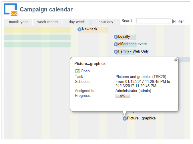 프로그램에서 직접 작업을 만들어 특정 캠페인이 아닌 전체 조직과 관련된 작업을 관리할 수 있습니다(예: 프로그램 내에서 예정된 캠페인의 주제를 논의하기 위한 모임). 작업이 프로그램 일정에 나타납니다.