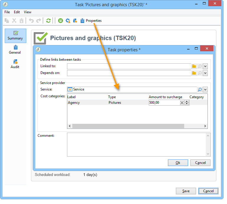 이렇게 하려면 작업 속성을 편집하고 관련 서비스 공급자를 선택합니다. 서비스 제공자와 연관된 비용 범주는 창의 중앙 섹션에 자동으로 나열됩니다.