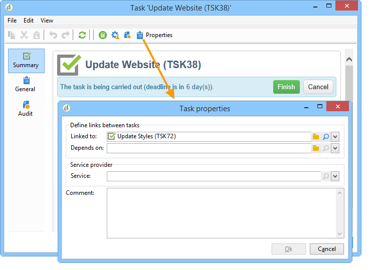 그러나 그룹화 작업에 연결할 작업을 이미 만든 경우에는 Linked to 필드 Properties 상자.