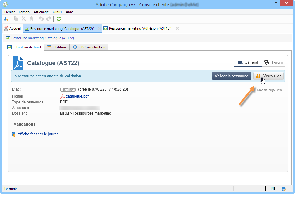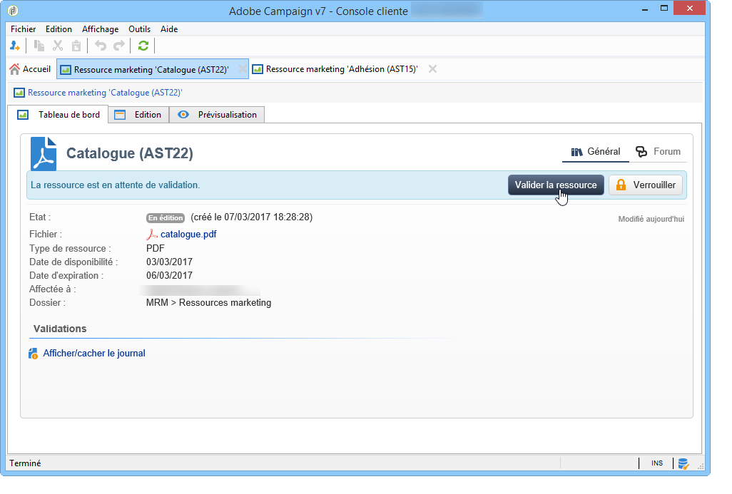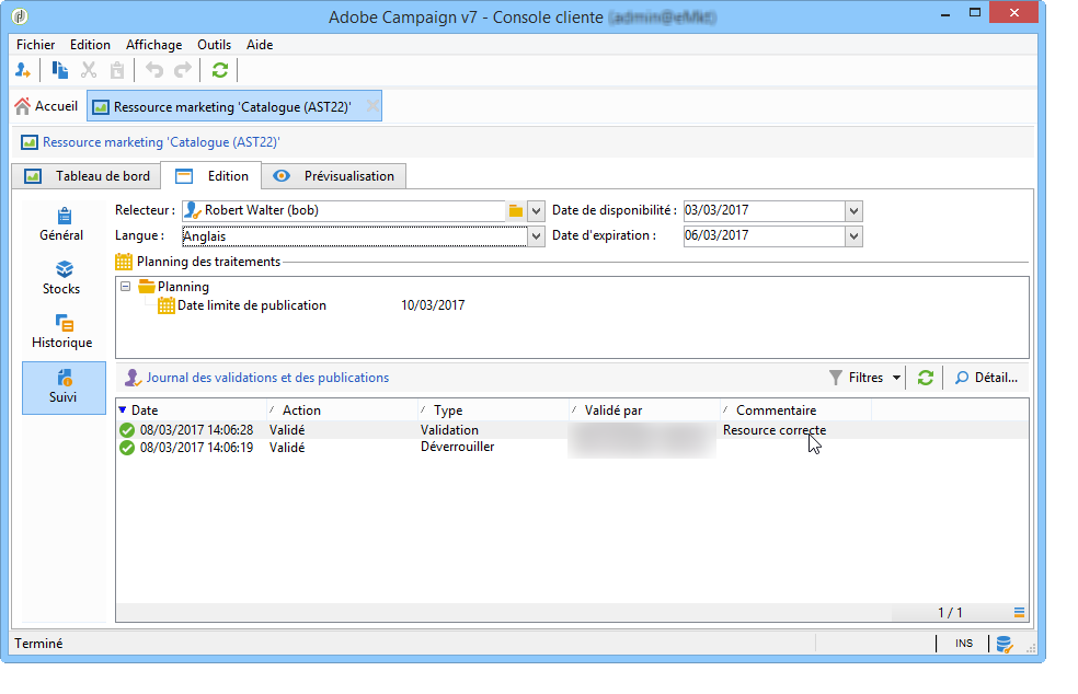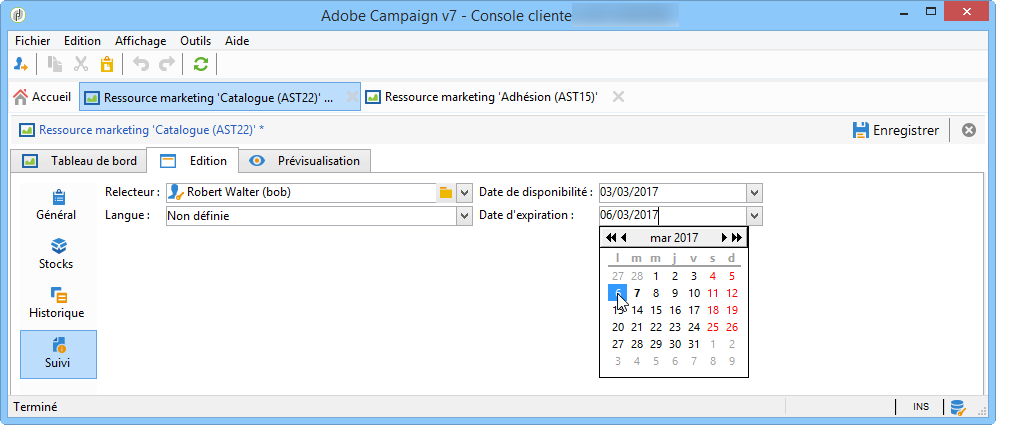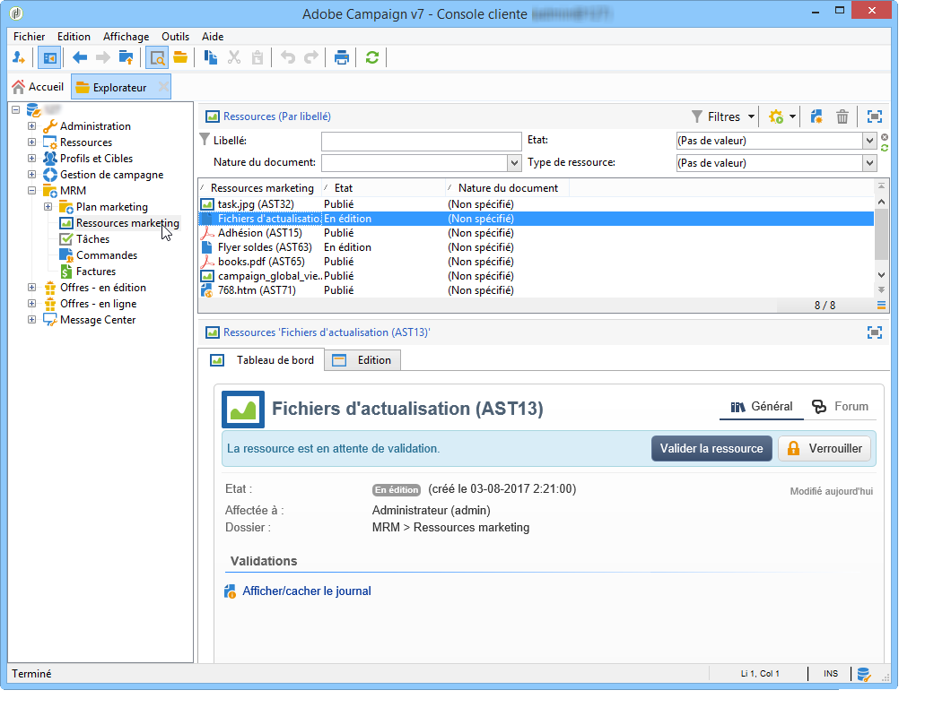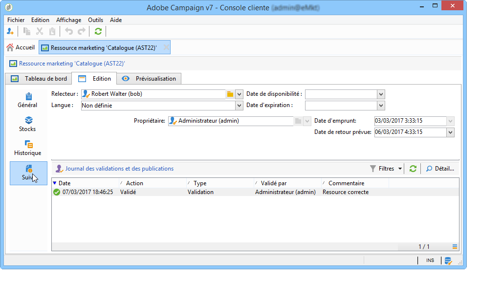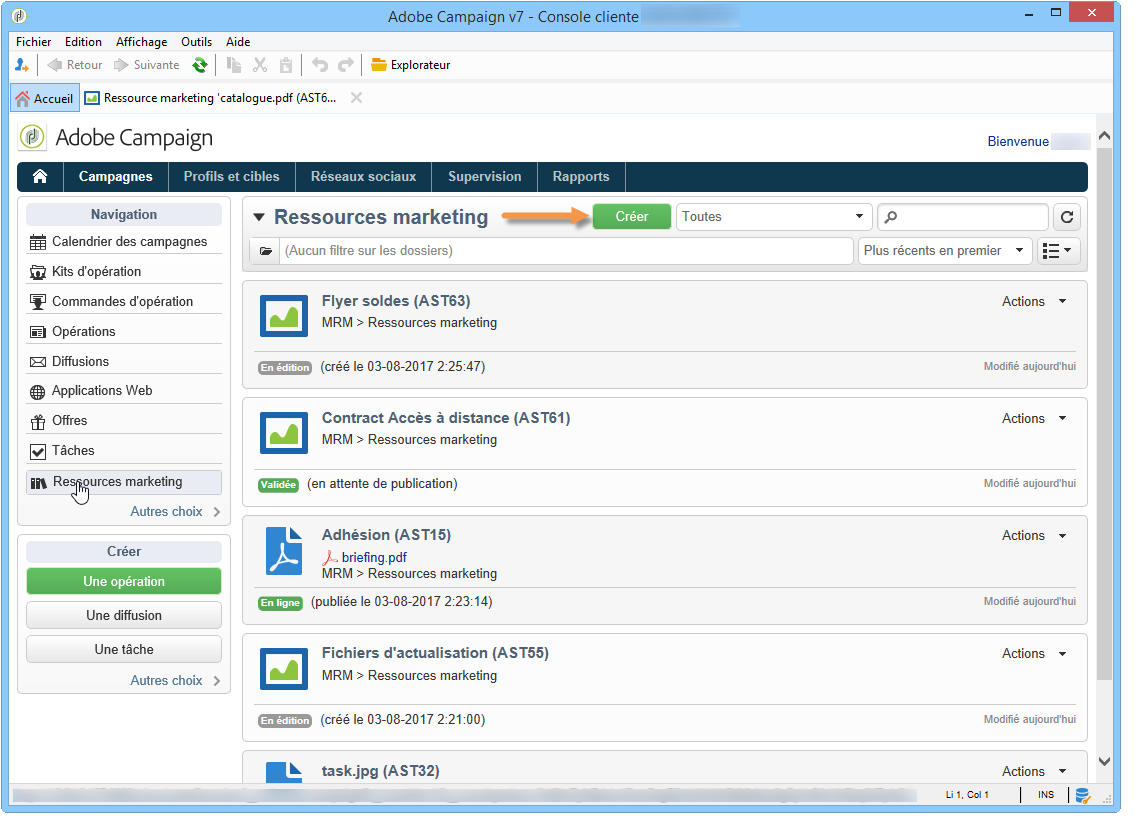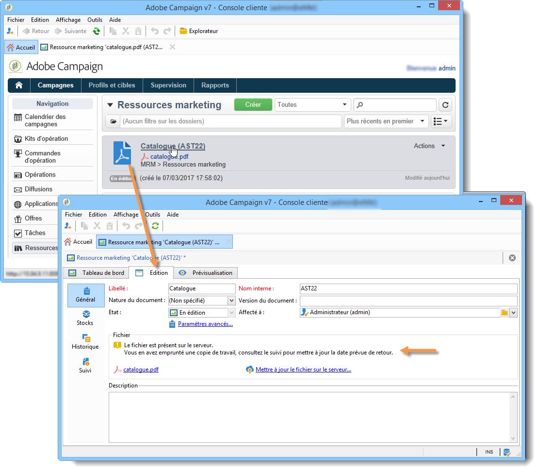 Adobe Campaign permet d'assurer le suivi et le tracking des ressources marketing impliquées dans le cycle de vie des opérations. Ces ressources marketing peuvent être par exemple une brochure, un visuel, ou tout autre support de communication sur lequel plusieurs opérateurs sont appelés à intervenir.