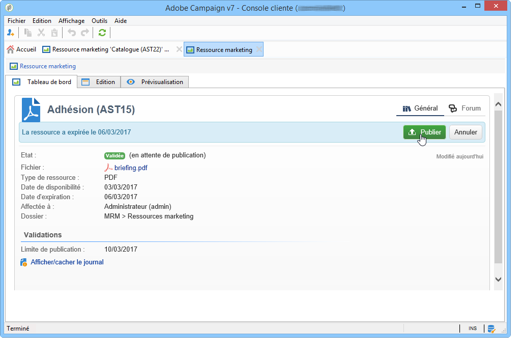 Vous pouvez modifier et mettre à jour une ressource marketing et, au besoin, en informer les autres opérateurs Adobe Campaign. Ainsi, vous pouvez :