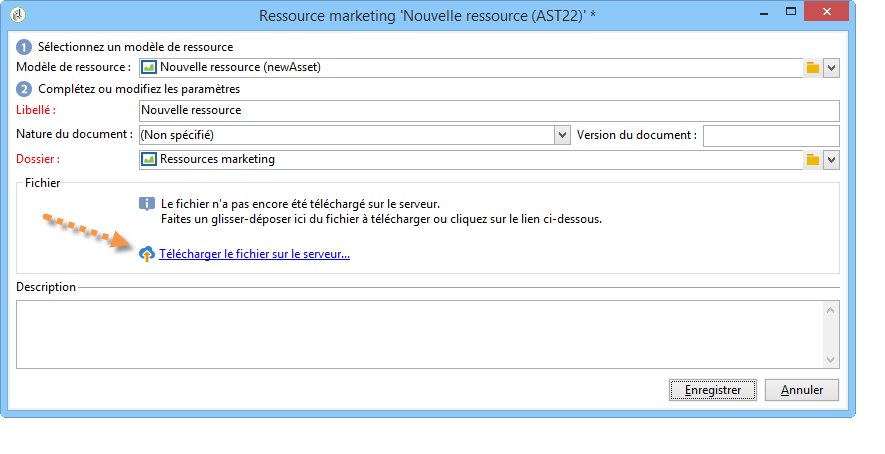Pour mettre à disposition une ressource sur le serveur Adobe Campaign, vous devez ajouter la ressource souhaitée par un glisser-déposer dans la zone centrale de l'éditeur. Vous pouvez également cliquer sur le lien Télécharger le fichier sur le serveur….