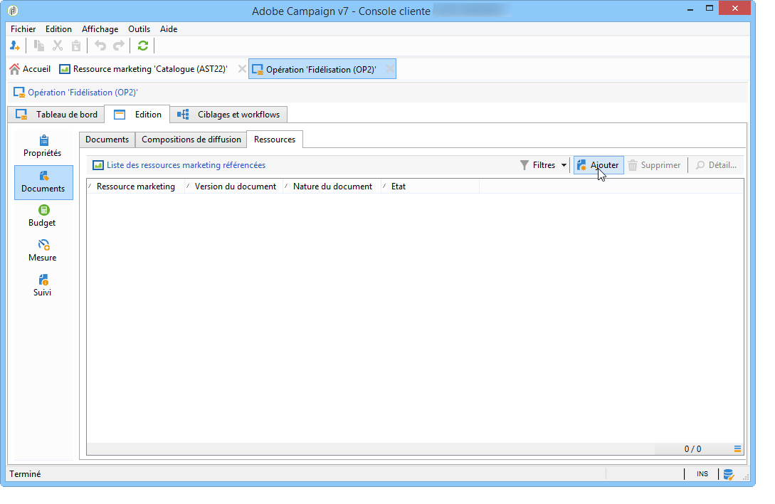 Pour cela, cliquez sur l'onglet Documents > Ressources dans le tableau de bord de l'opération, puis cliquez sur Ajouter pour sélectionner la ressource visée.