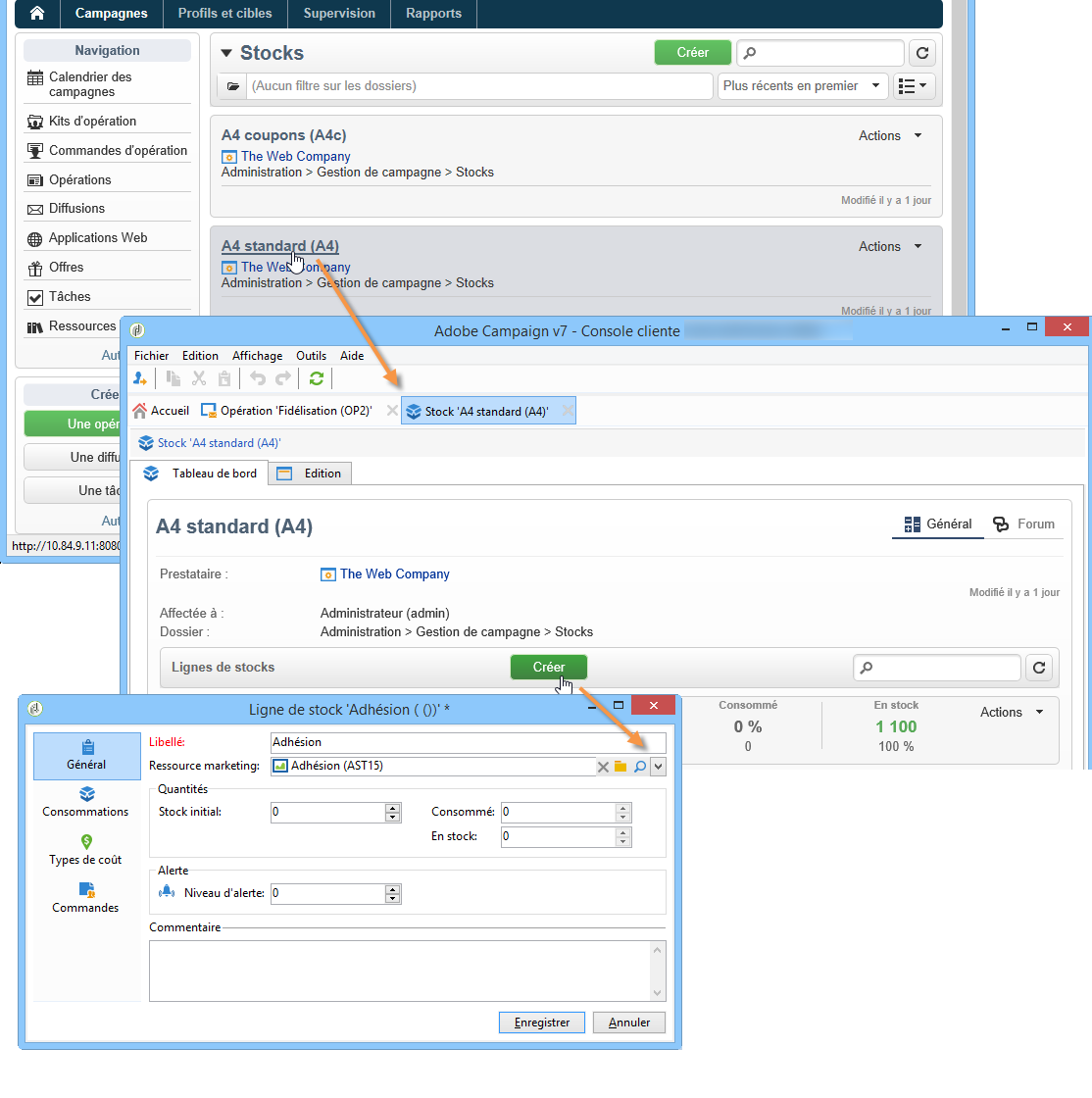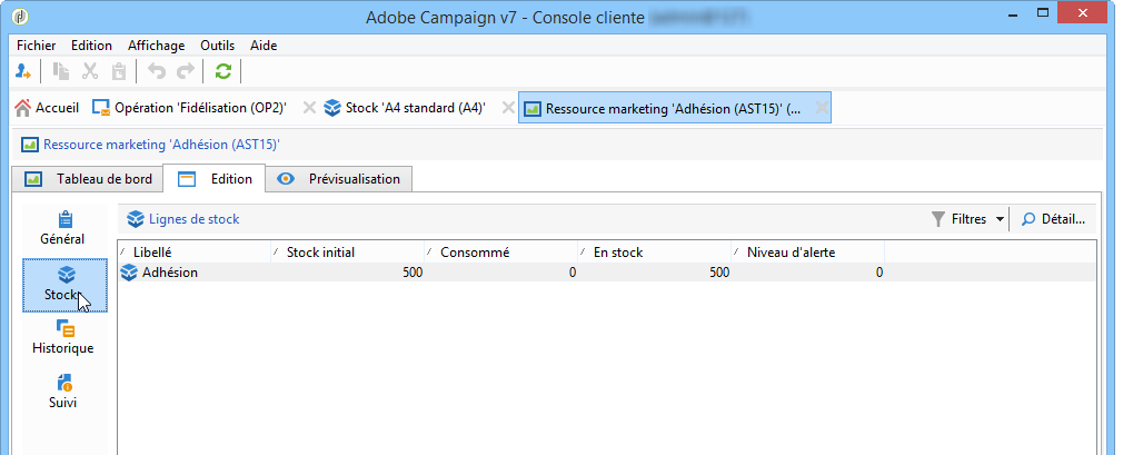 Vous pouvez associer une ressource marketing à un ou plusieurs stocks afin de gérer l'approvisionnement et, au besoin, en cas de stock insuffisant, afficher une alerte dans le tableau de bord.