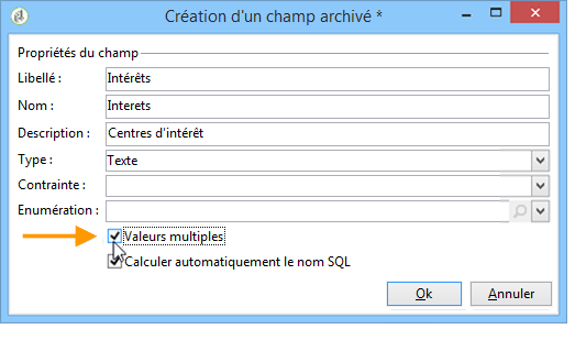 De plus, l'espace de stockage pour ce champ de saisie doit être un champ archivé de type Valeurs Multiples :