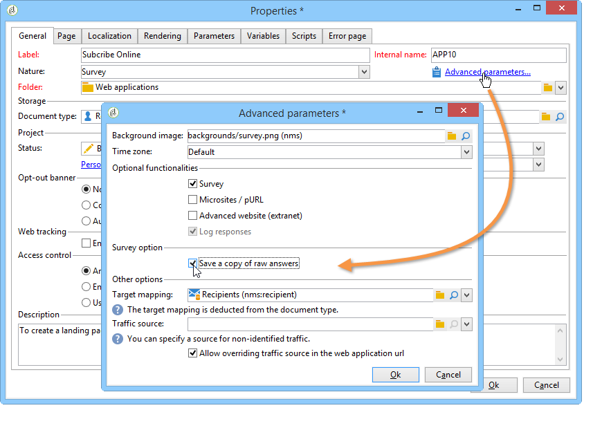 모든 설문 조사에 대해 기본적으로 활성화할 수 있습니다(이 옵션은 설문 조사가 게시될 때 적용됨). 이렇게 하려면 NmsWebApp_XmlBackup 옵션 및 값 할당 1 아래와 같이 변경하는 것을 의미합니다.
