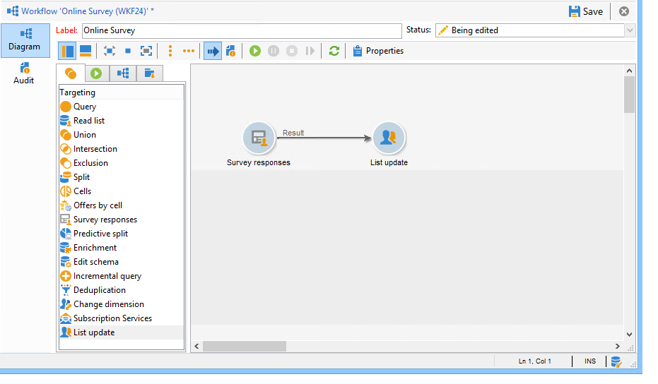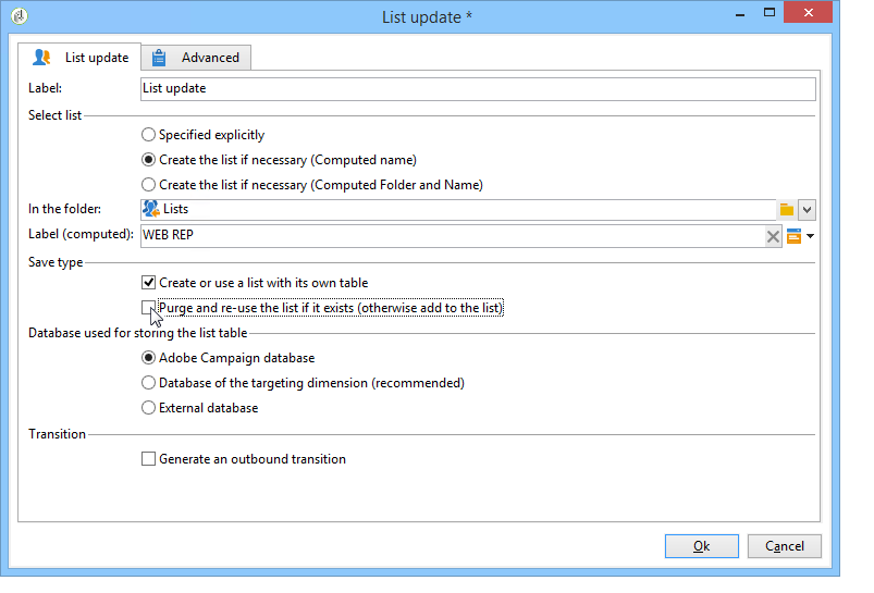 이 활동에서 업데이트할 목록을 지정하고 Purge and re-use the list if it exists (otherwise add to the list) 옵션: 답변이 기존 테이블에 추가됩니다. 이 옵션을 사용하면 큐브의 목록을 참조할 수 있습니다. 목록에 연결된 스키마는 각 업데이트에 대해 다시 생성되지 않으므로 이 목록을 사용하는 큐브의 무결성을 보장합니다.