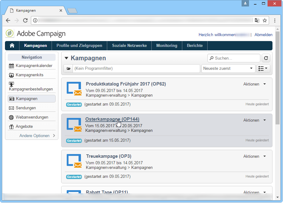 Adobe Campaign umfasst mehrere Lösungen, mit denen Sie Kampagnen personalisieren und auf allen Online- und Offline-Kanälen versenden können. Sie können Marketing-Kampagnen erstellen, konfigurieren, ausführen und analysieren. Die Anwendung stellt somit ein einheitliches Kontrollzentrum dar, über das alle Marketing-Kampagnen verwaltet werden können.