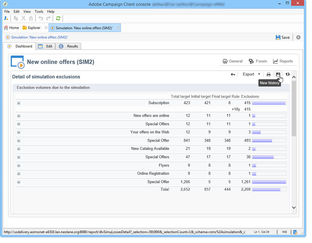 결과를 비교하려면 보고서를 사용해야 합니다. 실제로 Adobe Campaign을 사용하면 보고서 기록을 저장하여 나중에 다시 볼 수 있습니다. 이 기록은 시뮬레이션의 라이프 사이클 전체에서 저장됩니다.