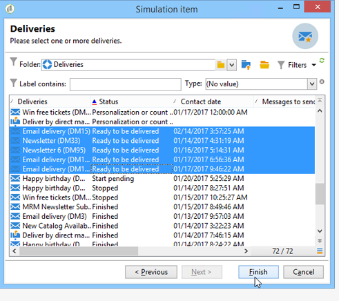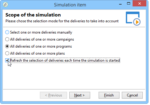계획, 프로그램 또는 캠페인을 통해 게재를 선택하는 경우, Adobe Campaign에서는 시뮬레이션이 시작될 때마다 고려하도록 게재 목록을 자동으로 새로 고칠 수 있습니다. 이렇게 하려면 Refresh the selection of deliveries each time the simulation is started 선택 사항입니다.