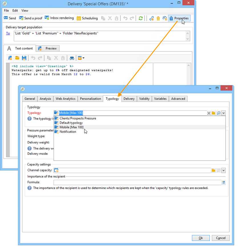 다음 예제에서는 SMS 오퍼가 100명 이상의 수신자에게 전송되지 않도록 규칙을 만들려고 합니다. 이 규칙은 캠페인 유형화에 연결된 다음, 관련 오퍼를 사용할 수 있는 SMS 게재에 연결됩니다.
