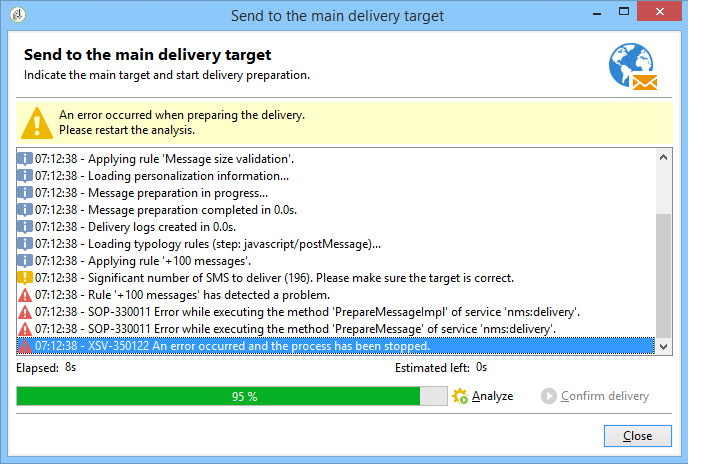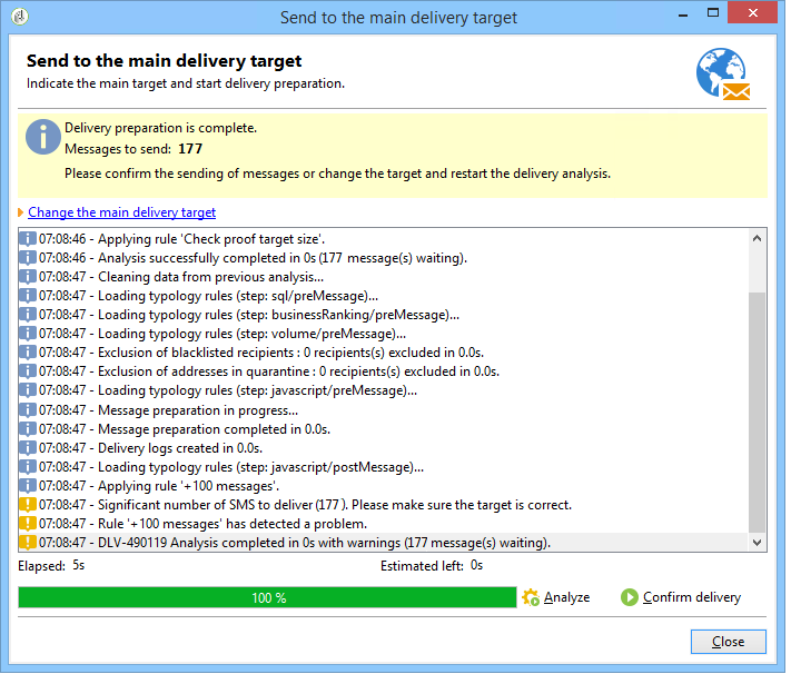 if( delivery.FCP == false && delivery.properties.toDeliver > 100 ) { logWarning("Significant number of SMS to deliver (" + delivery.properties.toDeliver + "). Please make sure the target is correct.") return false; } return true