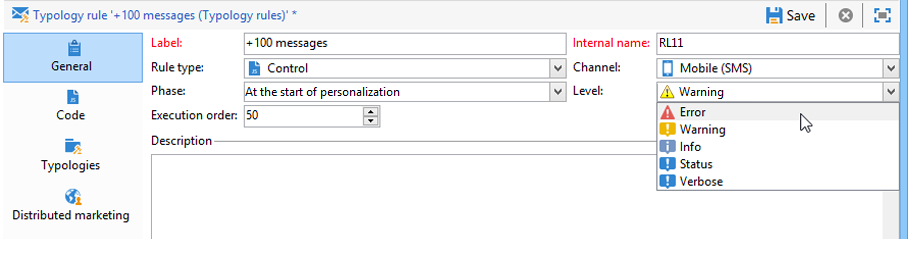 필요에 따라 새 제어 규칙을 만들 수 있습니다. 이렇게 하려면 Control 유형화 규칙을 입력하고 SQL에서 제어 공식을 입력합니다 Code 탭.
