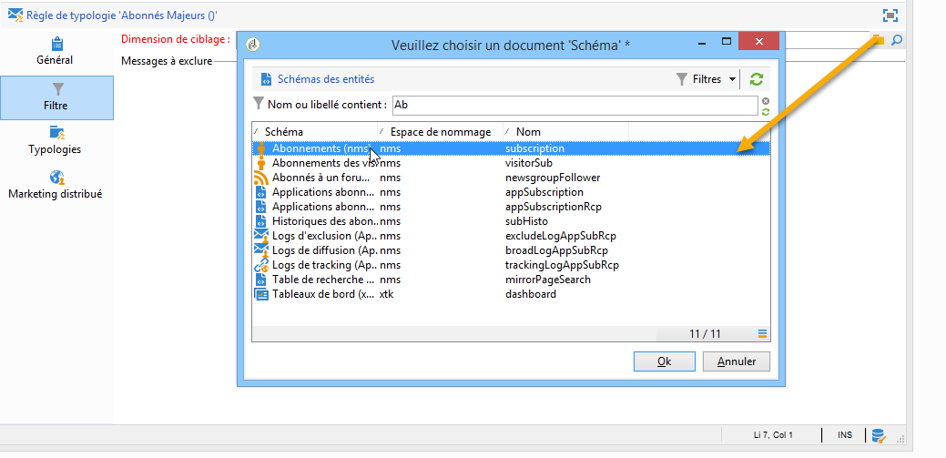 Seules les typologies et règles de filtrage sont proposées dans la fenêtre de sélection.