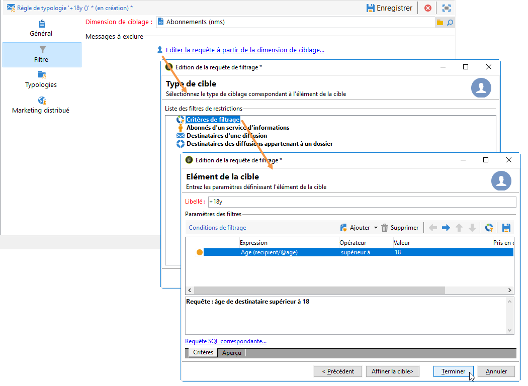 Les règles de filtrage permettent de définir les messages à exclure en fonction de critères définis dans une requête. Ces règles sont associées à une dimension de ciblage.