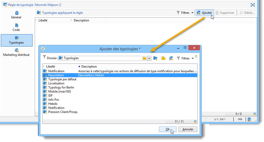 Sélectionnez ensuite la ou les typologies de filtrage à appliquer à la diffusion. Pour cela, cliquez sur le bouton Ajouter et sélectionner la typologie à appliquer.