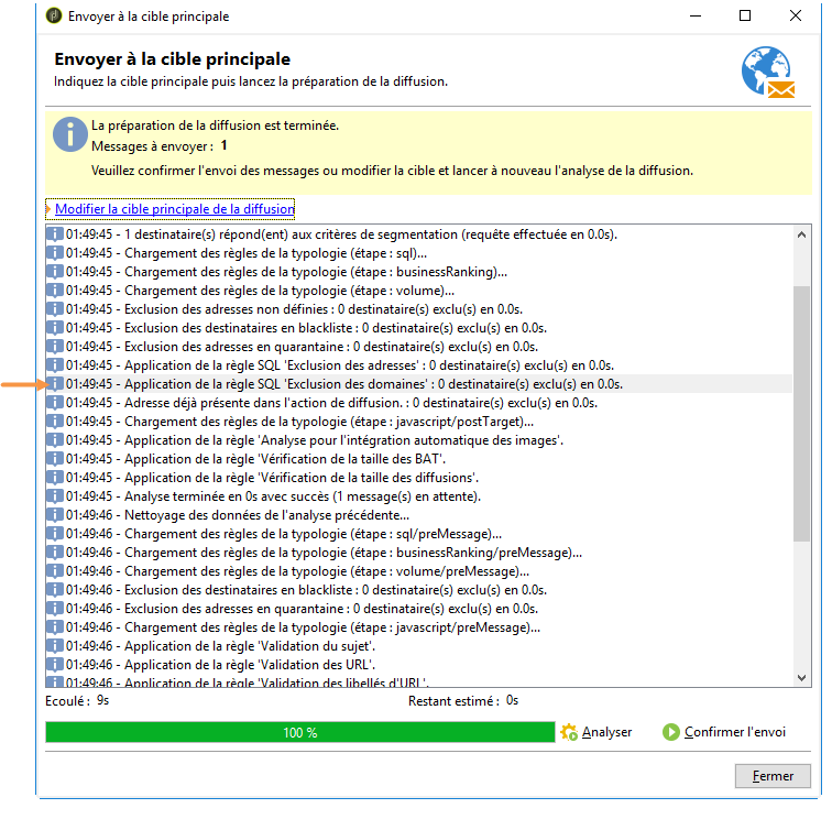 Les adresses et les noms de domaine contenus dans la liste de suppression globale sont masqués. Seul le nombre des destinataires exclus est indiqué dans les logs d'analyse de diffusion.