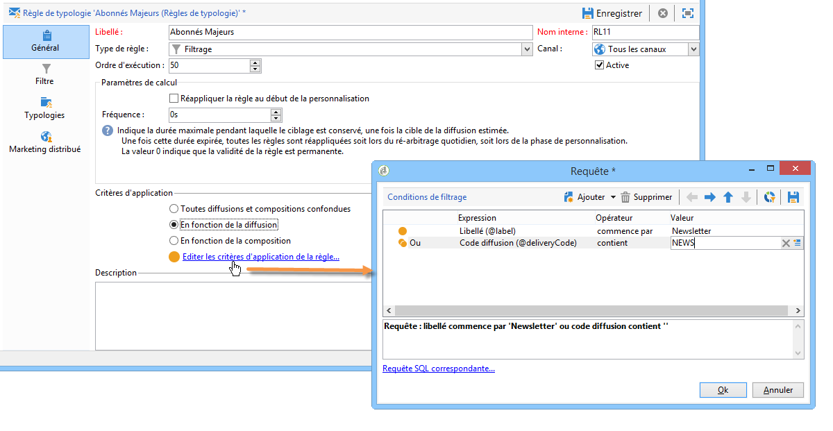 Dans ce cas, même si la règle est associée à toutes les diffusions, elle ne sera appliquée qu'aux diffusions répondant aux critères du filtre défini.