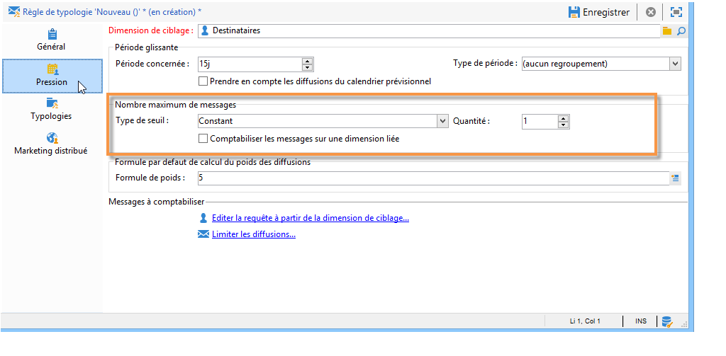 Editez l'onglet Pression : dans la section Nombre maximum de messages, nous allons créer une formule de calcul du seuil qui dépendra de chaque destinataire. Sélectionnez la valeur Dépend du destinataire dans le champ Type de seuil puis cliquez sur l'icône Editer l'expression située à droite du champ Formule.