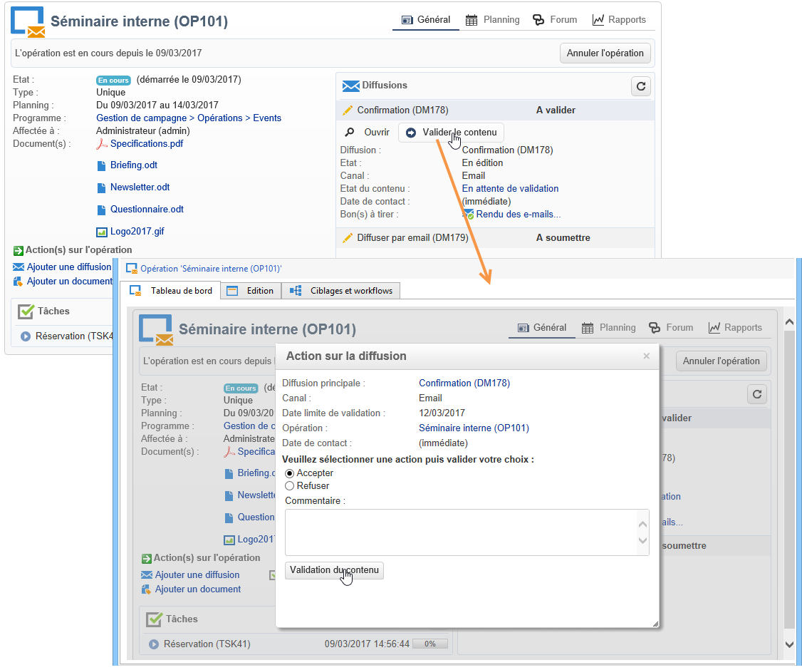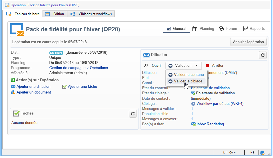 Un lien Valider le contenu est proposé dans le tableau de bord de l'opération, comme dans l'exemple ci-dessous :