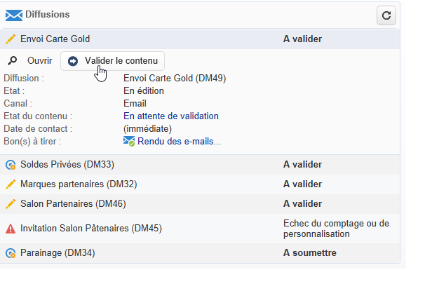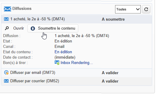 Les boutons de validation sont alors affichés dans le tableau de bord de l'opération (au niveau de cette diffusion), dans le tableau de bord de la diffusion et dans le tracking des diffusions. Si les notifications sont activées, elles seront parallèlement envoyées.