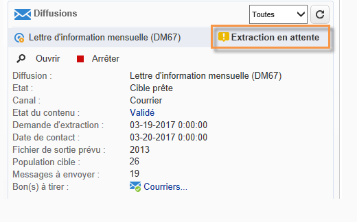 A la date de la demande d'extraction, le fichier d'extraction est créé et la diffusion passe à l'état Fichier à valider.