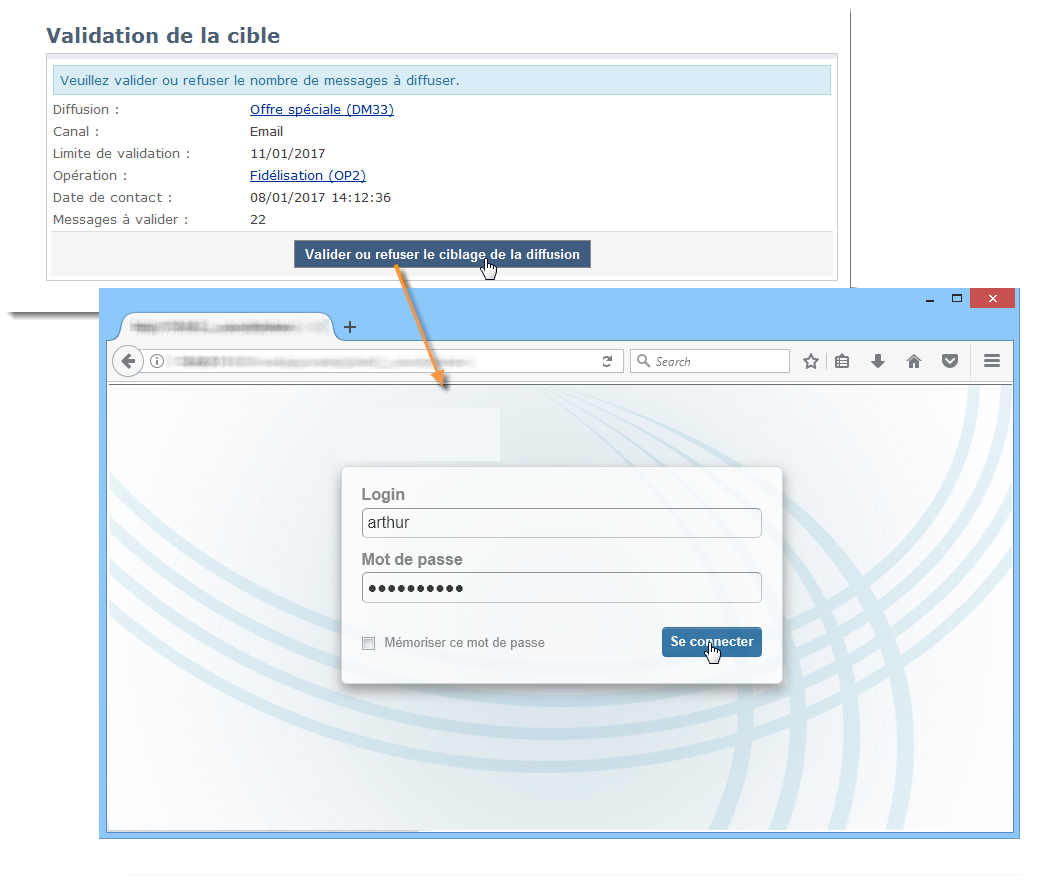 Les notifications sont des emails spécifiques envoyés aux opérateurs validants afin de les avertir qu'un traitement est en attente de validation. Lorsque l'opérateur clique sur le lien contenu dans le message, il accède à une page d'authentification. Après connexion, il peut consulter les éléments concernés puis valider ou non le traitement. Il peut également saisir un commentaire dans la fenêtre de validation.