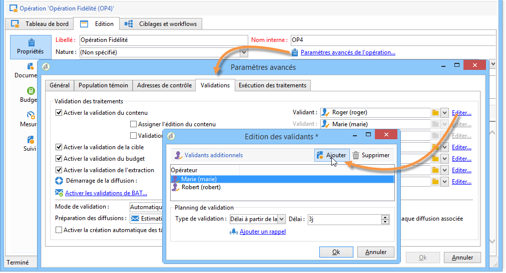 Les traitements qui doivent faire l'objet d'une validation sont sélectionnés dans le modèle de l'opération (onglet Propriétés > Paramètres avancés de l’opération… > Validations), ainsi que le(s) responsable(s) des validations (ils recevront les messages de notification, sauf si cette option n'est pas activée). Pour plus d’informations, consultez cette section.