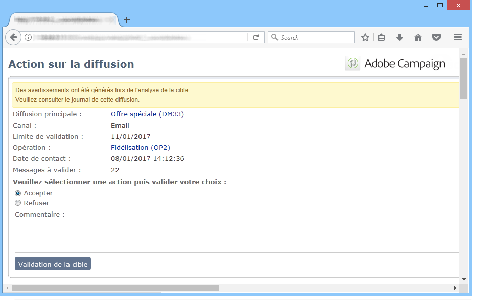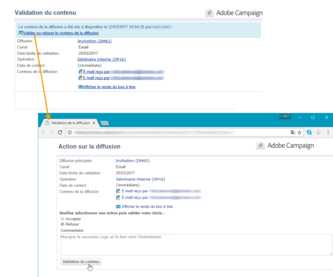 Pour chaque opération, vous pouvez valider la cible de diffusion, le contenu (voir Validation du contenu) et les coûts. Les opérateurs Adobe Campaign en charge de la validation peuvent être avertis par e-mail et peuvent accepter ou refuser la validation depuis la console ou via une connexion web. Voir les Étapes de validation d’une diffusion.