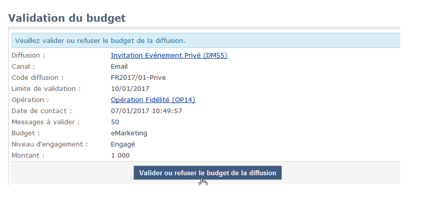 Lorsque les options Activer la validation de la cible, Activer la validation du contenu ou Activer la validation du budget sont sélectionnées dans la fenêtre de paramétrage de la validation des traitements, alors les liens correspondants sont proposés dans le tableau de bord de l'opération pour les diffusions concernées.
