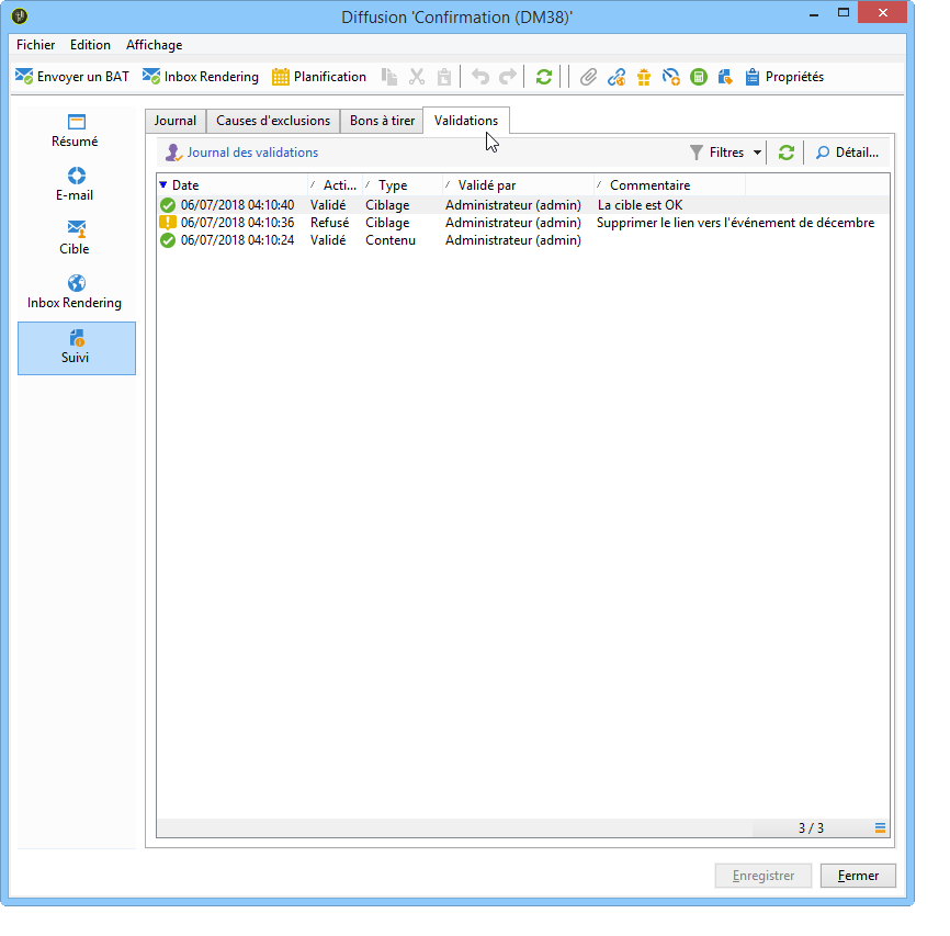 Ces informations sont également accessibles depuis l'onglet Tracking > Validations de chaque diffusion :