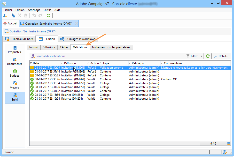 L’information est également disponible dans les logs de validation de l’opération. Ils sont accessibles à partir de l’onglet Édition > Tracking > Validations.