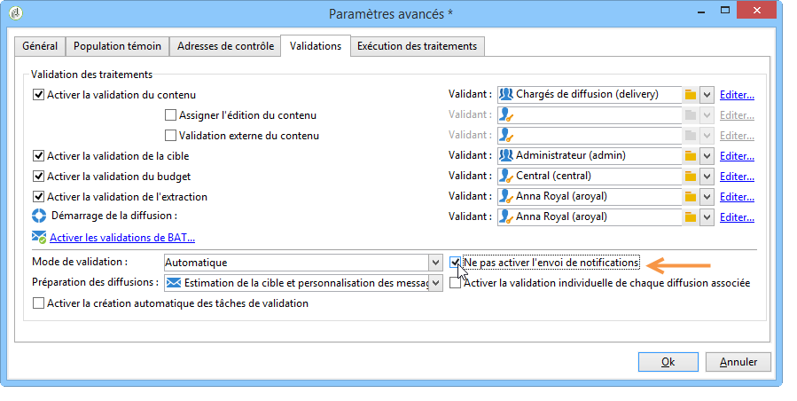 Pour cela, éditez la fenêtre de validation de l'opération ou du modèle d'opération concerné (onglet Edition > Propriétés > Paramètres avancés de l'opération… > Validations) et cochez l'option Ne pas activer l'envoi de notifications.