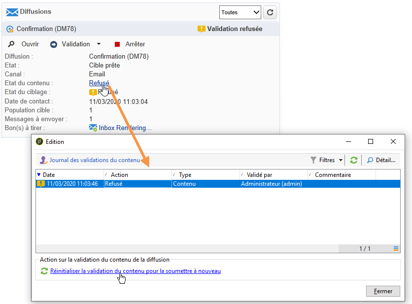 A tout moment, le responsable de l'opération peut relancer le cycle de validation du contenu. Pour cela, cliquez sur le lien situé sur la ligne Etat du contenu, dans le tableau de bord de l'opération (au niveau de la diffusion), puis cliquez sur Réinitialiser la validation du contenu pour la soumettre à nouveau.