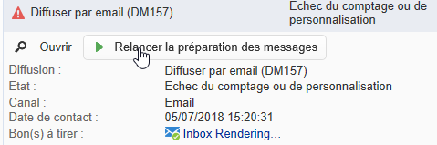 Lors d'un workflow de ciblage, si une erreur liée à un problème de paramétrage s'est produite au cours de la préparation des messages, le tableau de bord propose le lien Relancer la préparation des messages. Corrigez l'erreur, puis cliquez sur ce lien afin de relancer la préparation des messages sans repasser par la phase de ciblage.