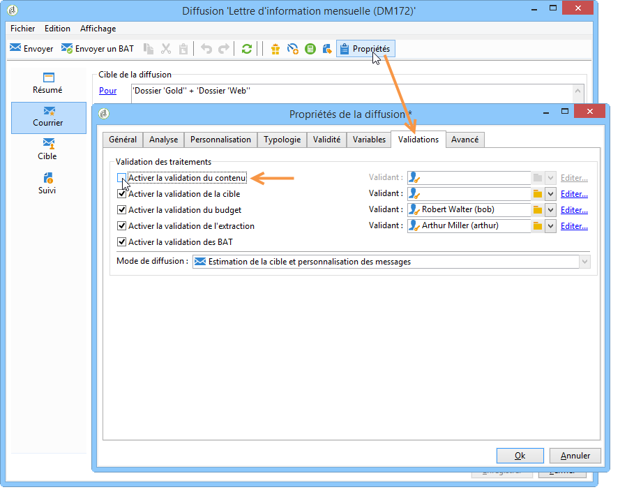 Ce paramétrage peut être surchargé au niveau de chaque opération créée depuis ce modèle et également unitairement au niveau de chacune des diffusions de l'opération, en cliquant sur le bouton Propriétés puis sur l'onglet Validations.