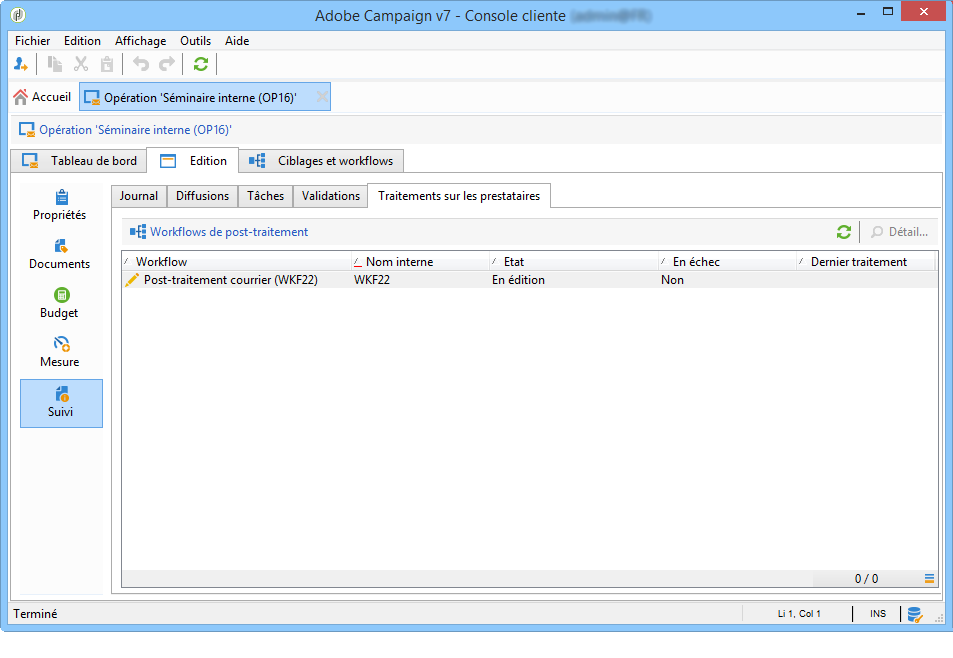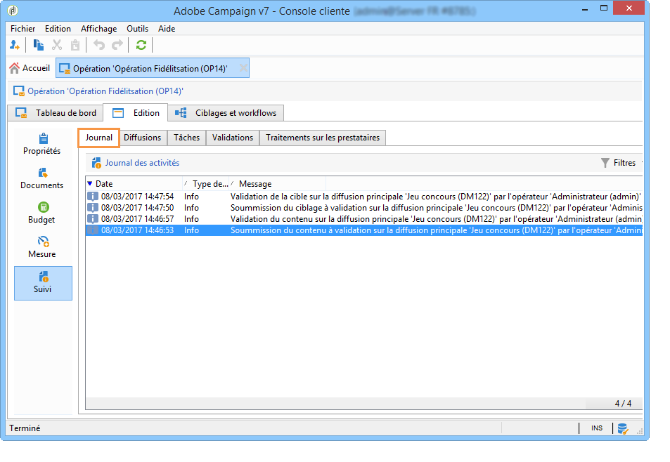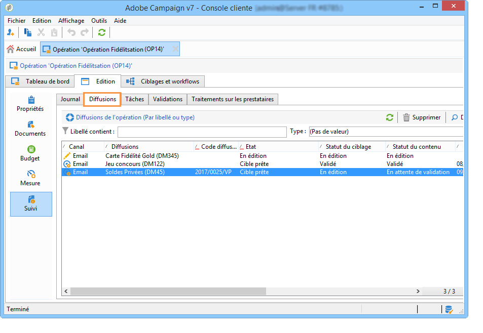 Les informations relatives aux traitements exécutés dans une opération sont regroupées dans l'onglet Edition > Suivi de l’opération. Vous pouvez y visualiser la liste des diffusions de l'opération. En savoir plus.