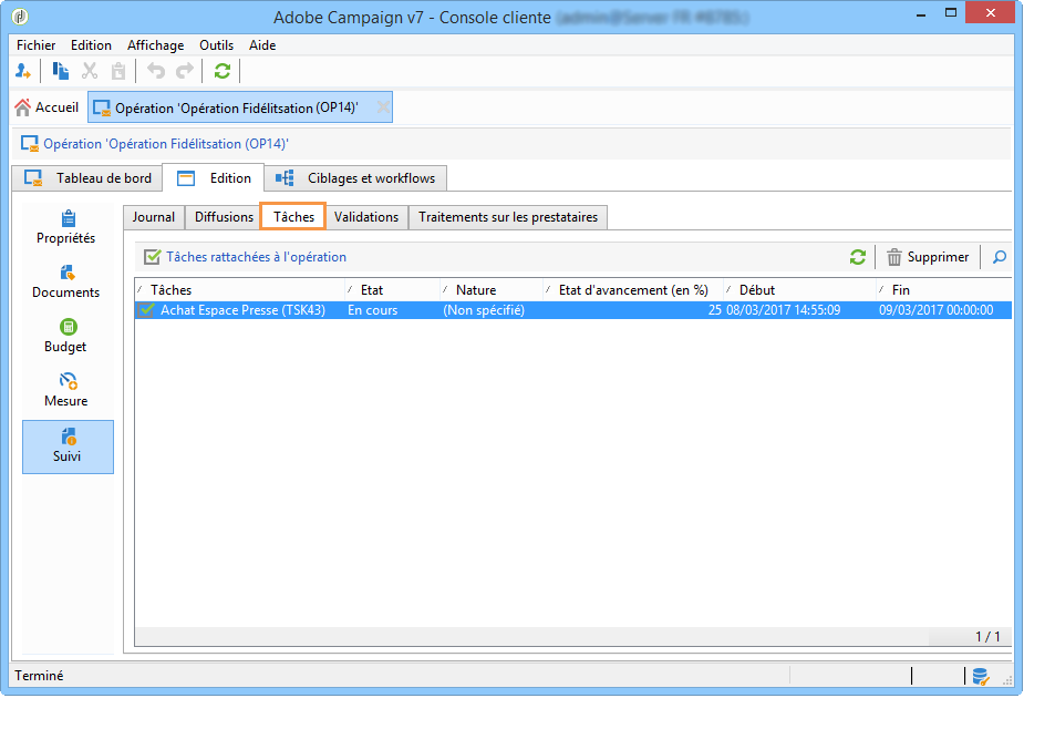 Le sous-onglet Tâches regroupe toutes les tâches rattachées à l’opération. Cette vue vous permet de les éditer ou de les supprimer. Les tâches sont disponibles avec l'application MRM. Elles sont présentées dans cette section.